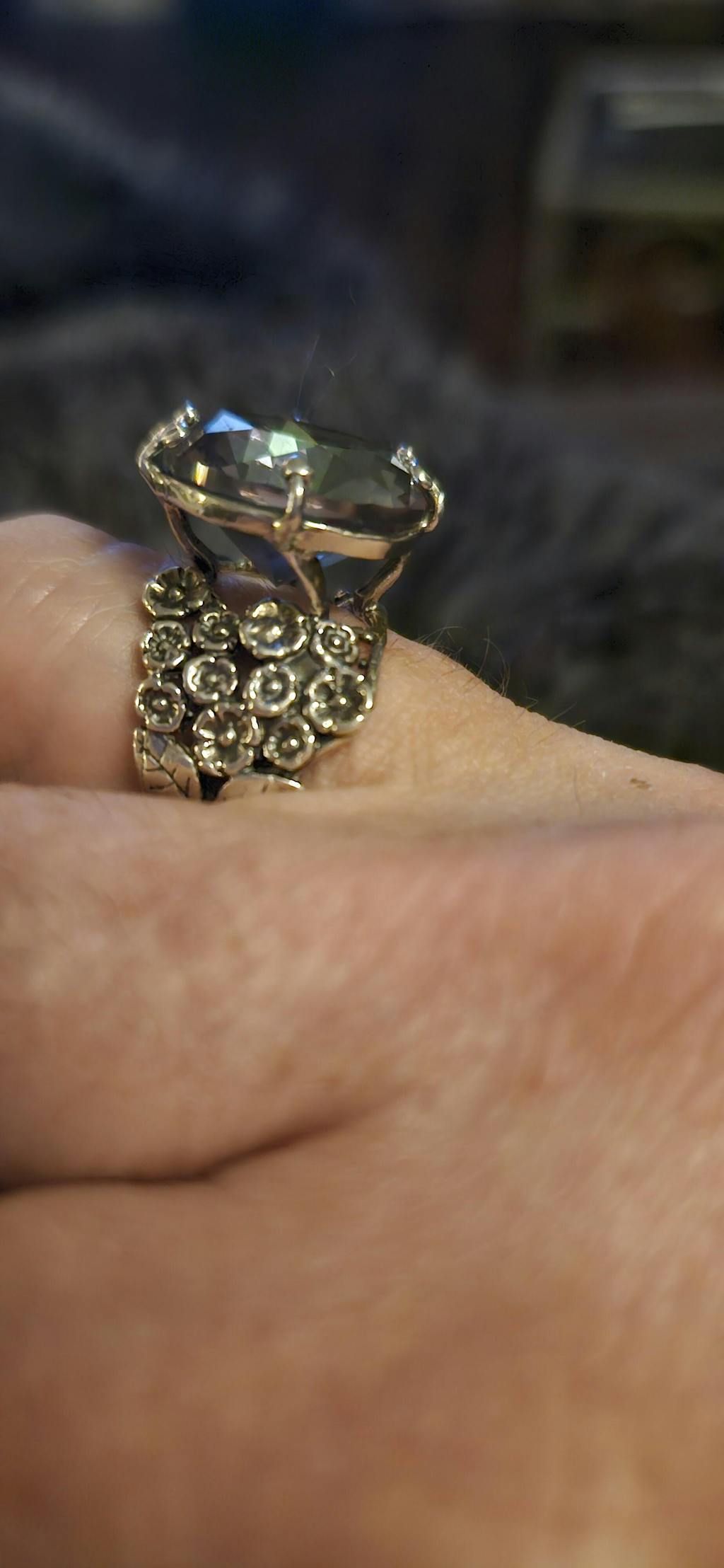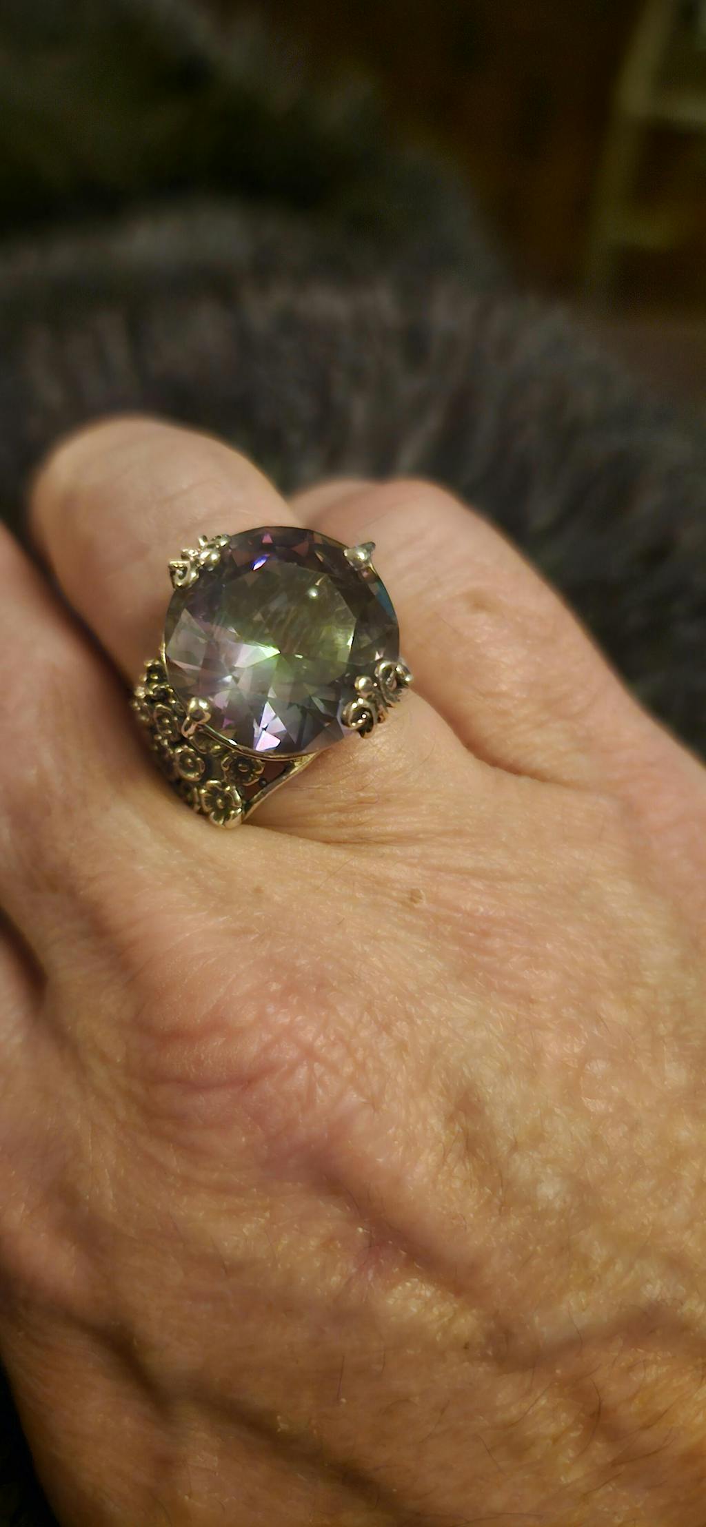 Luxurious and bold, this sterling silver rings features a beautiful rainbow mystic crystal that's out of this world. The band is adorned with silver florals for a touch of boho chic. Wear this ring all dressed up to a dinner party, or with a white tee and jeans for a casual cool look.